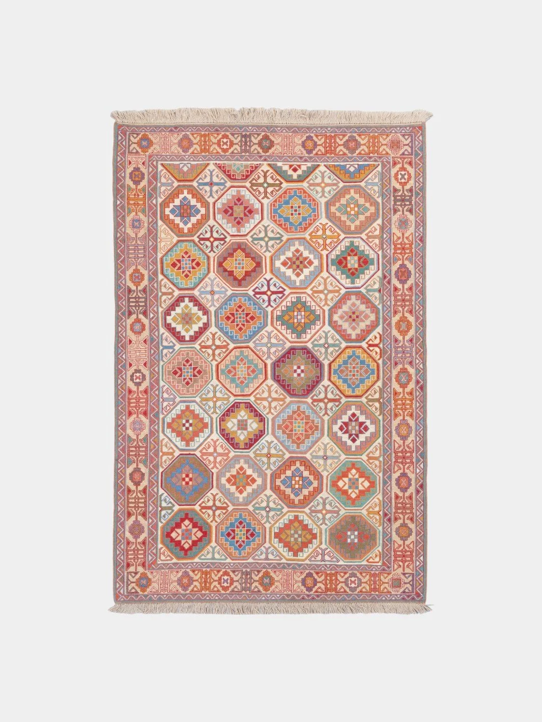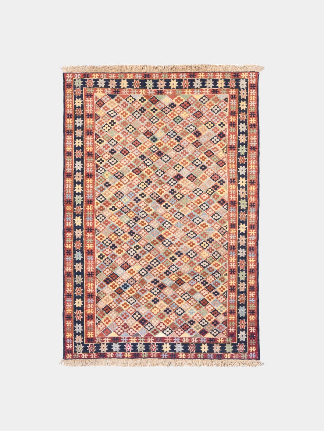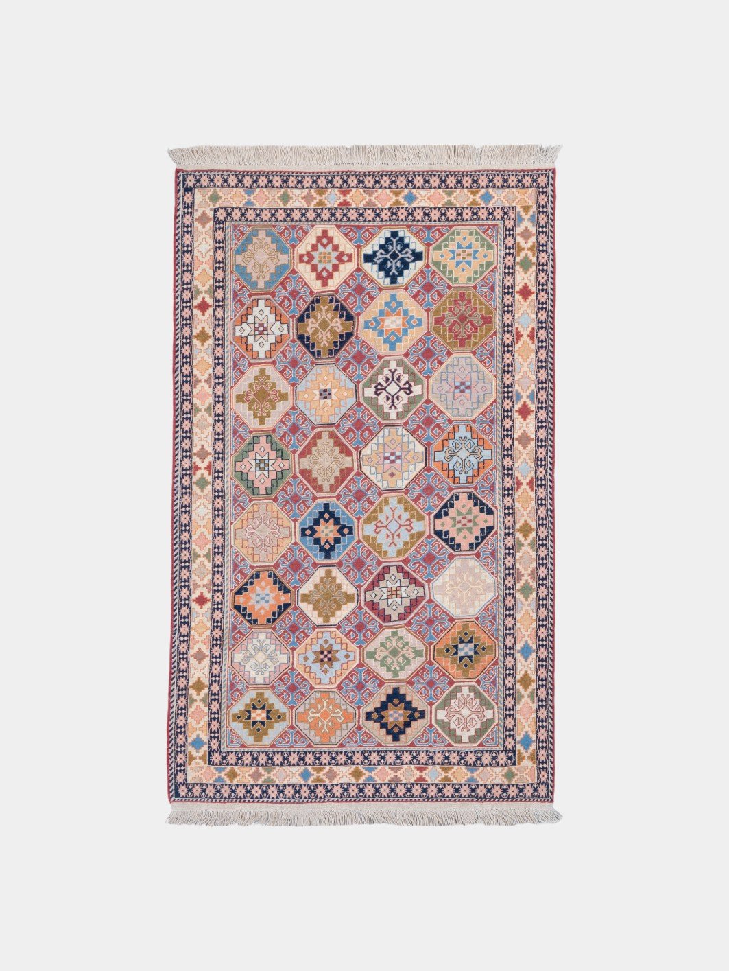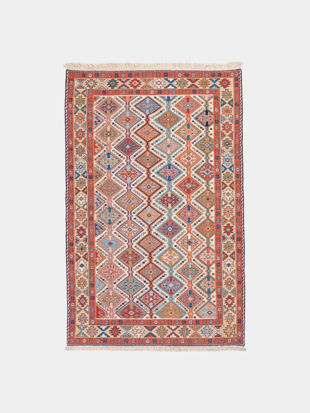Kilims are produced by tightly interweaving the warp and weft strands of the weave to produce a flat surface with no pile. Kilim weaves are tapestry weaves, technically weft-faced plain weaves, that is, the horizontal weft strands are pulled tightly downward so that they hide the vertical warp strands.